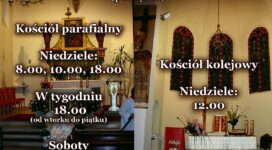 Przypominam, że od Świąt Wielkanocnych, po zakończonym remoncie zostały przywrócone Msze św. w kościele kolejowym. Msze św. niedzielne odprawiane będą w następującym porządku: 8.00 – kościół parafialny 10.00 – kościół parafialny 12.00 – kościół kolejowy 18.00 – kościół parafialny...